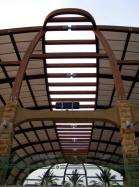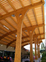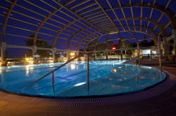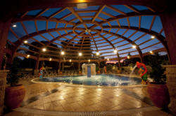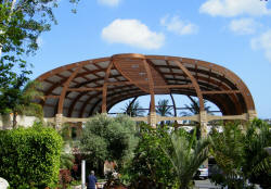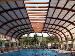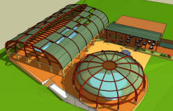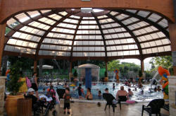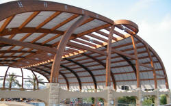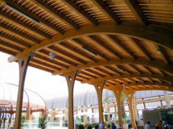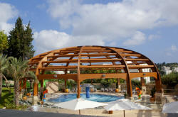 בריכת משפחות ובריכת פעוטות עם מבנה הצללה מעץ רב שכבתי וקירוי קפיטריה